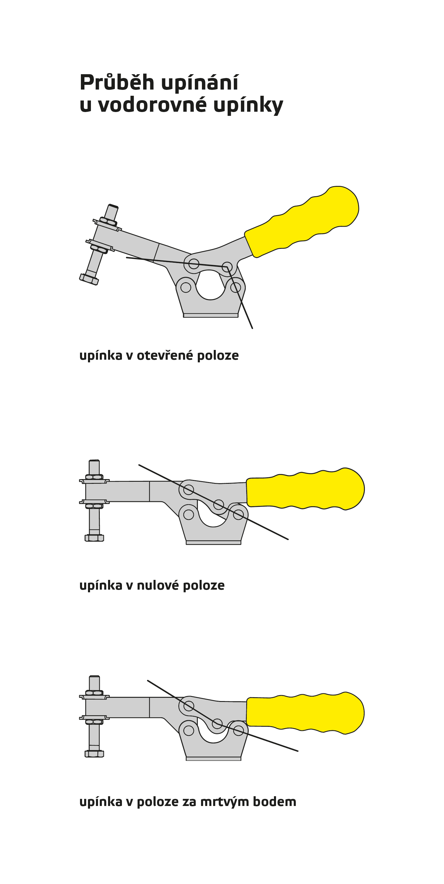 Všechny typy upínačů jsou opatřeny antikorozní ochranou zinkováním a plastovou olejivzdornou rukojetí jasně žluté barvy, která bezpečně pomáhá rozeznat polohu upínací páky v přípravku.