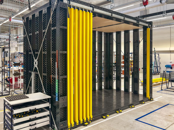 Na základě zadání jsme navrhli a sestavili upínací klec pro fixaci lepené kuchyňské konstrukce určené pro významného výrobce letadel. Základ konstrukce je tvořen svařovacím stolem Siegmund – System 16, ke kterému jsme připojili systémové U-Forma profily tvořící opěrné sloupy a střechu klece. Přední část konstrukce jsme také doplnili o speciálně vyrobený pojezd se svislými pohyblivými dílci.